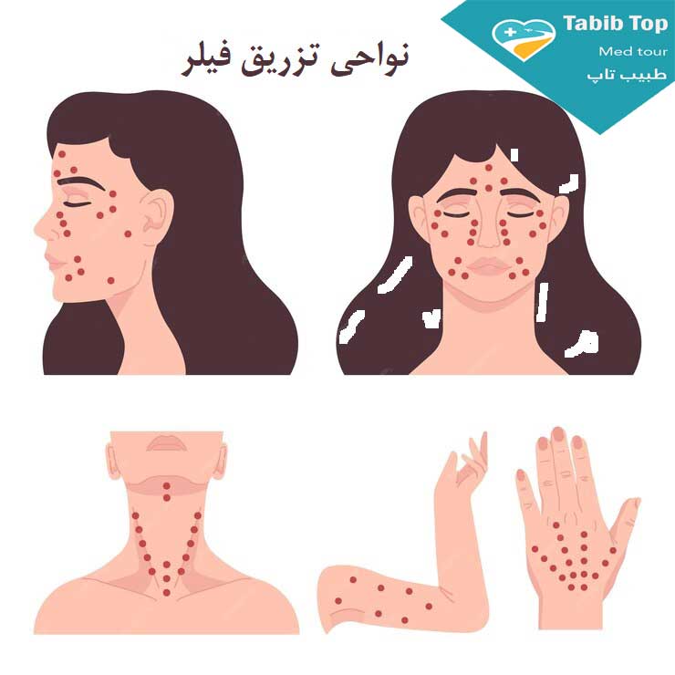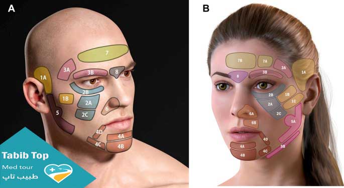 مناطق حقن الفيلر في الوجه للنساء والرجال كما هو موضح في الصورة:
