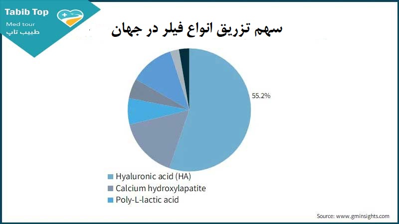 في الشكل أدناه، يمكنك مشاهدة نسبة حقن الفيلر في العالم. كما ترى، تستحوذ حقن حمض الهيالورونيك على أكبر حصة، حيث تمثل 55٪ من إجمالي الحقن.